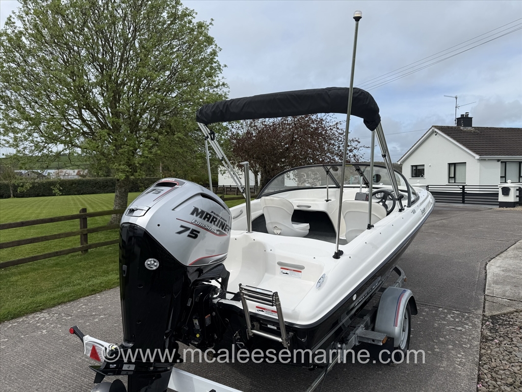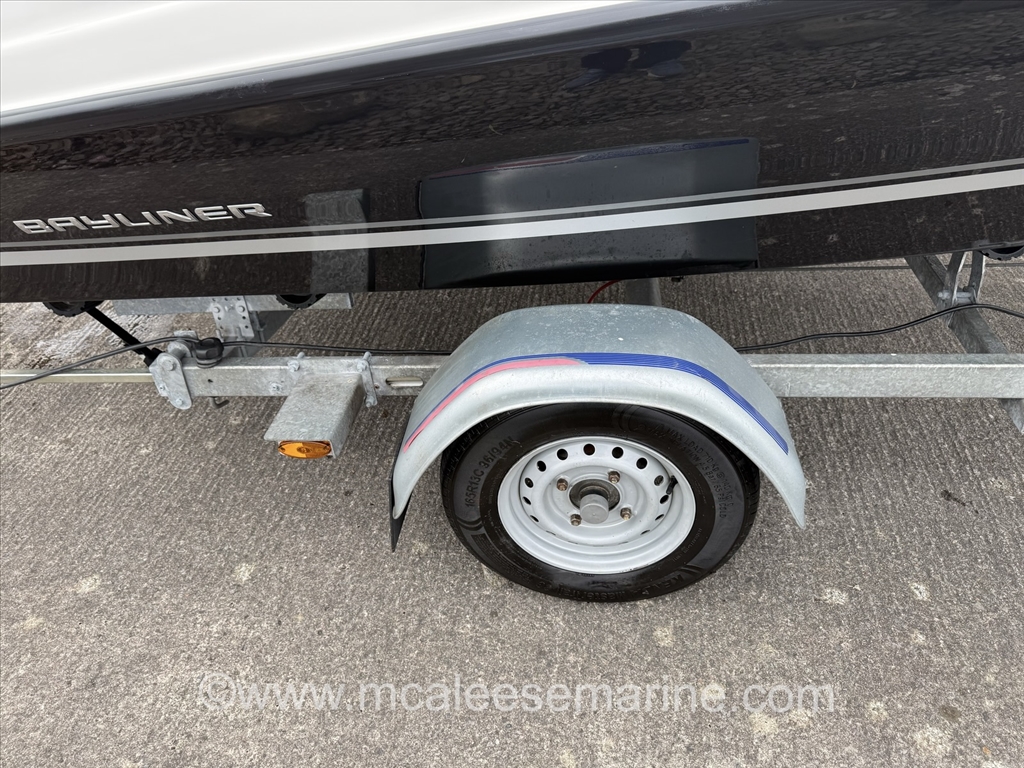 2020 Bayliner 160 bowrider powered with a Mariner F75 outboard Engine sitting on an Indespension road trailer.